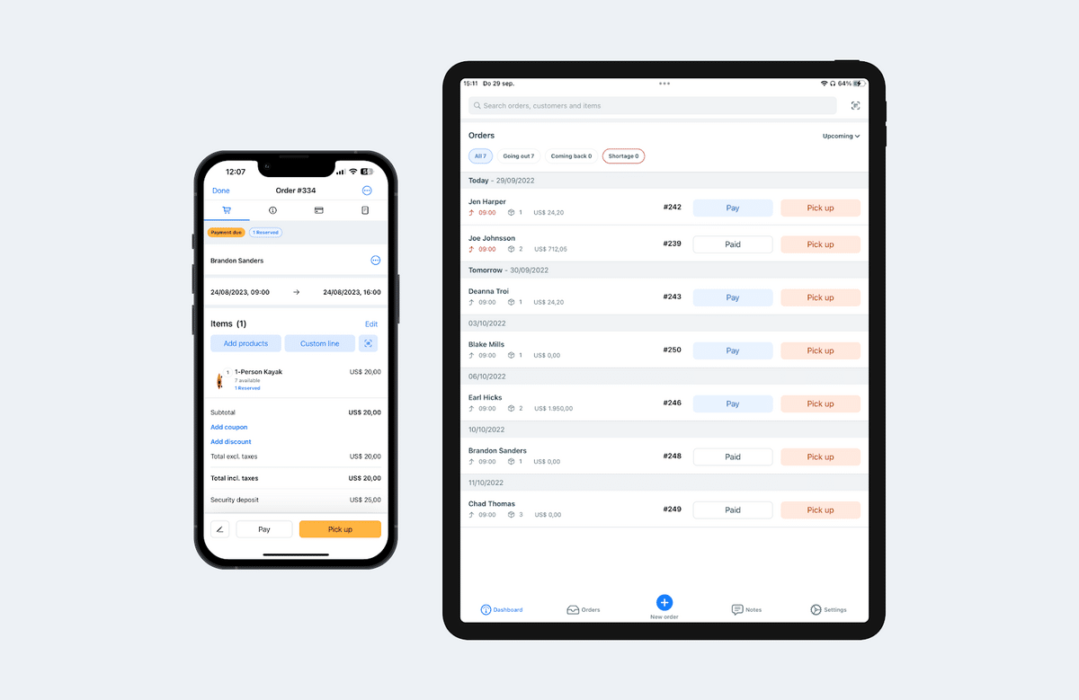 The Booqable mobile app lets you create and view orders, manage pickups and returns, and even use the built-in barcode scanner to check items in and out.