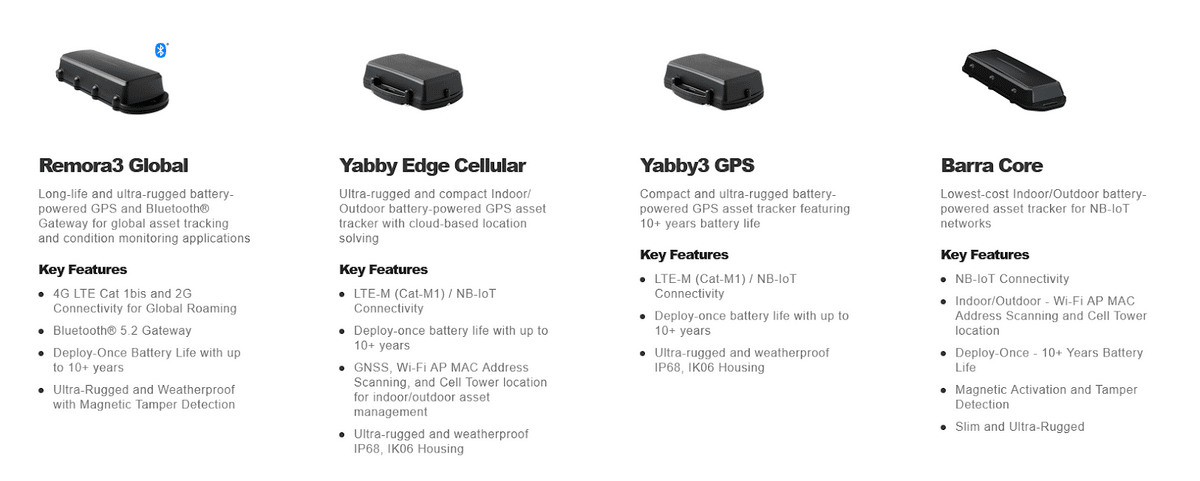 These trackers are battery-powered with up to 10 years of battery life and are also IP67-rated, which means they can withstand demanding environments like dust and rain.