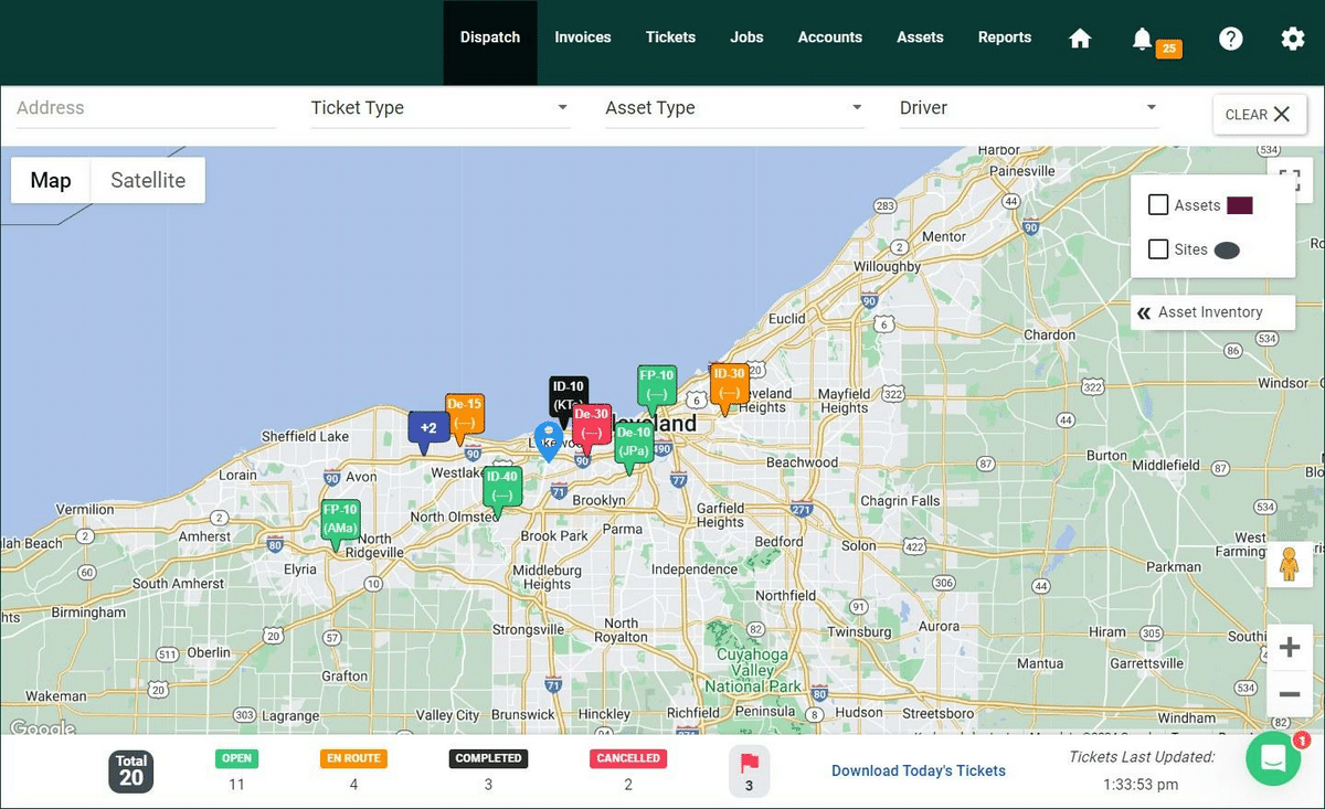 From the office, you can see where all your dumpsters are, sort tickets by asset type, and even check out the locations of dumpsters, landfills, and job sites on the dispatch map.