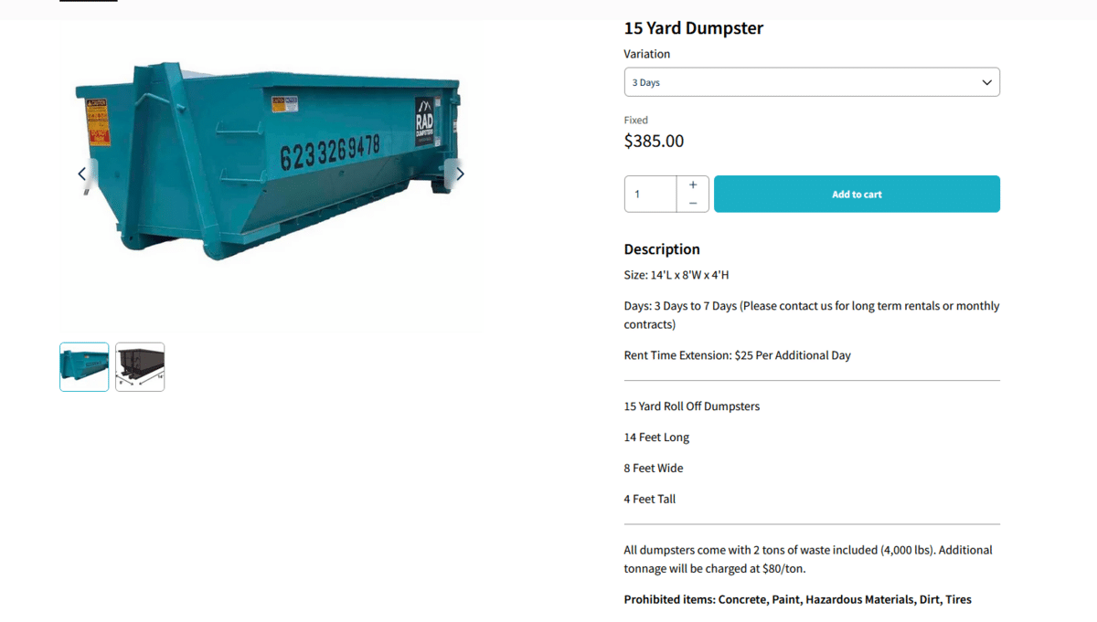 For example, Rad Dumpsters in Phoenix uses Booqable, so its potential customers can view all available dumpsters, see the rental price, and easily add the desired option to their cart:
