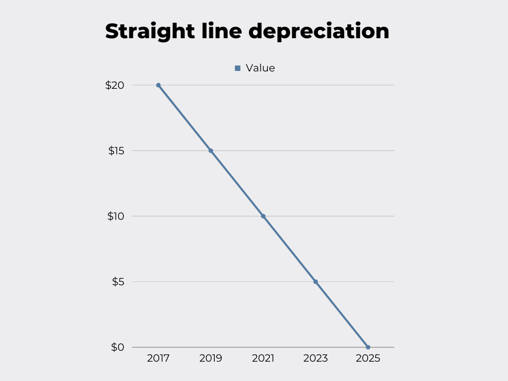 Companies can turn to several ways to calculate the depreciation of an asset. The below graph shows one approach, known as a straight line: