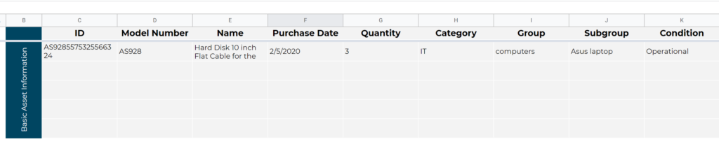 Asset ID: Includes barcodes, unique tracking IDs, or serial numbers. This might consist of 9 to 12 numbers or more.