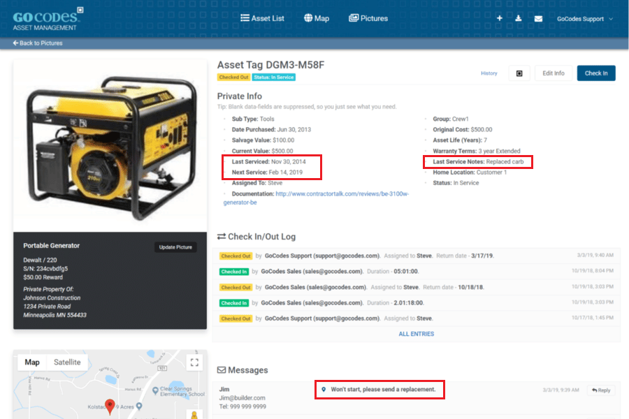 This is what maintenance information looks like in the GoCodes Asset Tracking asset management system: