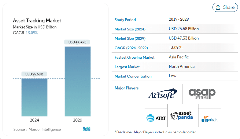 According to Mordor Intelligence, the global asset tracking market size is estimated at $25.58 billion in 2024 and is expected to grow at a 13.09% CAGR, reaching $47.33 billion by 2029.
