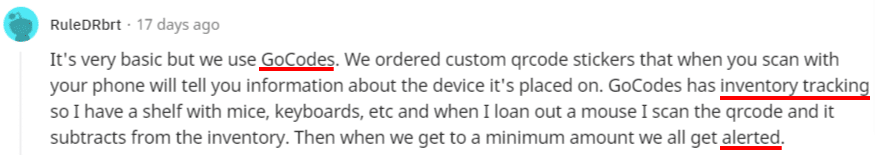The following reply by a satisfied customer perfectly sums up how GoCodes Asset Tracking helped them keep track of their inventory and even get handy alerts when stocks were running low.