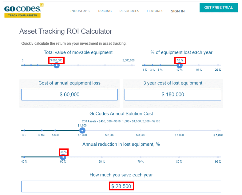 All these numbers are shown in this snapshot of the GoCodes Asset Tracking return-on-investment (ROI) calculator.