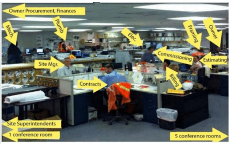 This is where the entire construction project team (client, architect, engineers, contractors, consultants, etc.) is located in a single space to enhance coordination and increase productivity, as illustrated below.