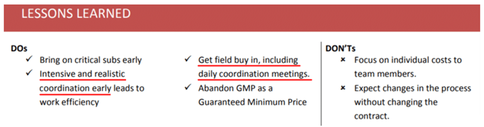 For instance, Consigli Construction Company co-located both teams at the project site during the project’s pre-construction stage.