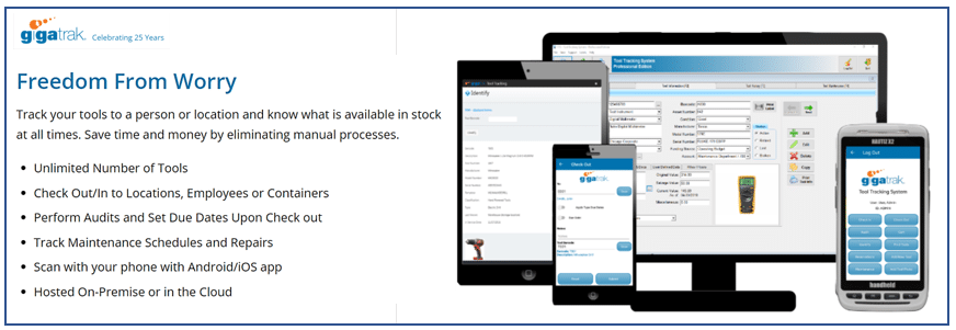 As you can see, GigaTrak can manage an unlimited number of tools, equipment, and consumable inventory and can be used for checking equipment in and out, audits, and maintenance scheduling.
