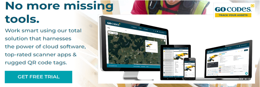 GoCodes Asset Tracking is a complete tool and equipment tracking solution that comes with patented, customizable QR code tags, cloud-based tracking software, and a scanner app for smartphones and other compatible devices.