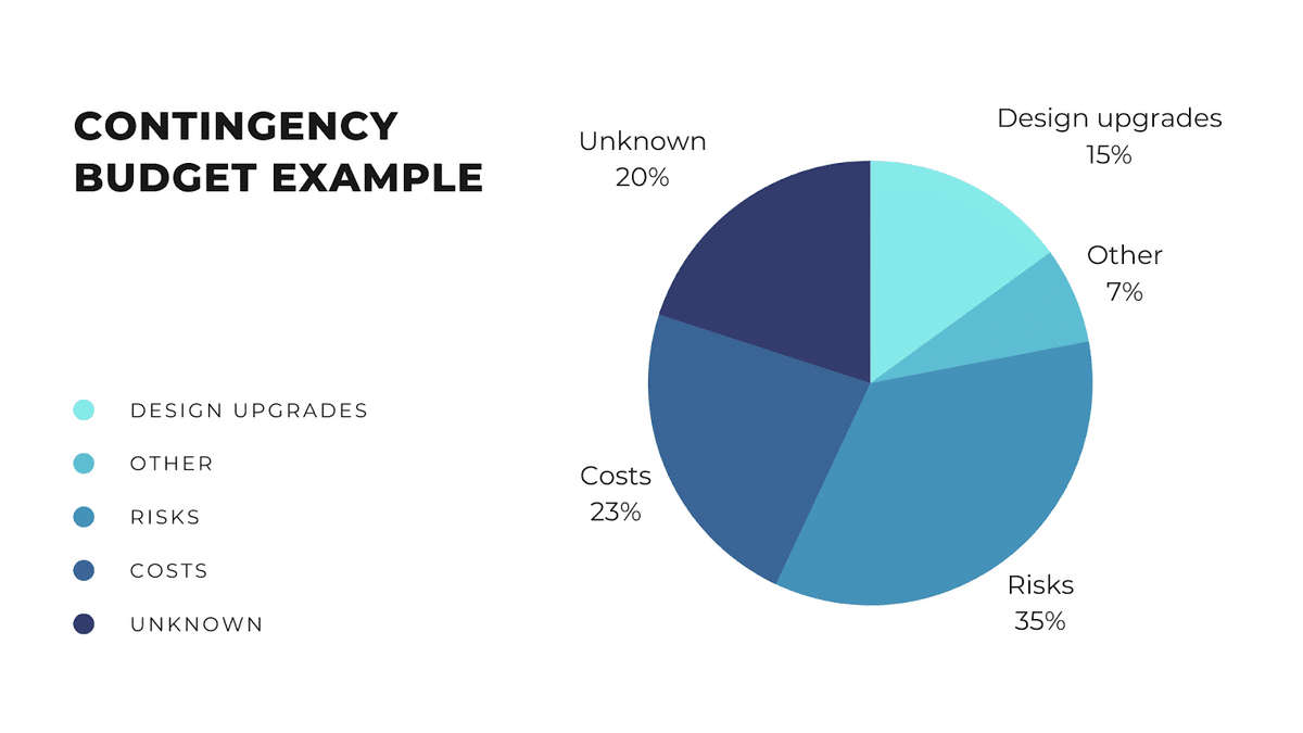 Some of the costs to include in your contingency budget are changes in the scope, design upgrades, material upgrades, accidents, natural hazards outside of human control, and malfunctions and breakdowns of equipment and tools.