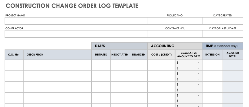A change order log is a list of all change order requests which capture details such as date, creator, status, and needed actions.