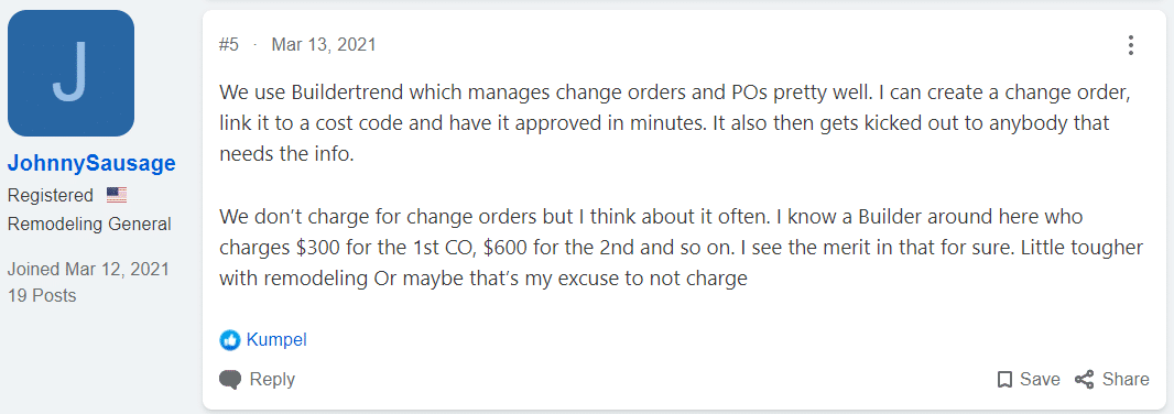 For example, this contractor sees the value in charging extra for change orders during construction that his colleague implements in his business practice.