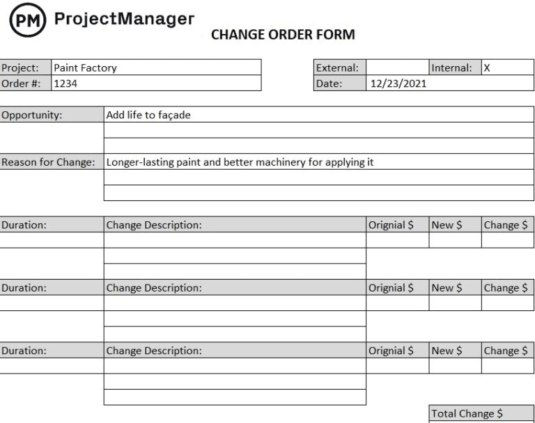 At the top, there are fields that include the project basics (change order number, date, name of the project).