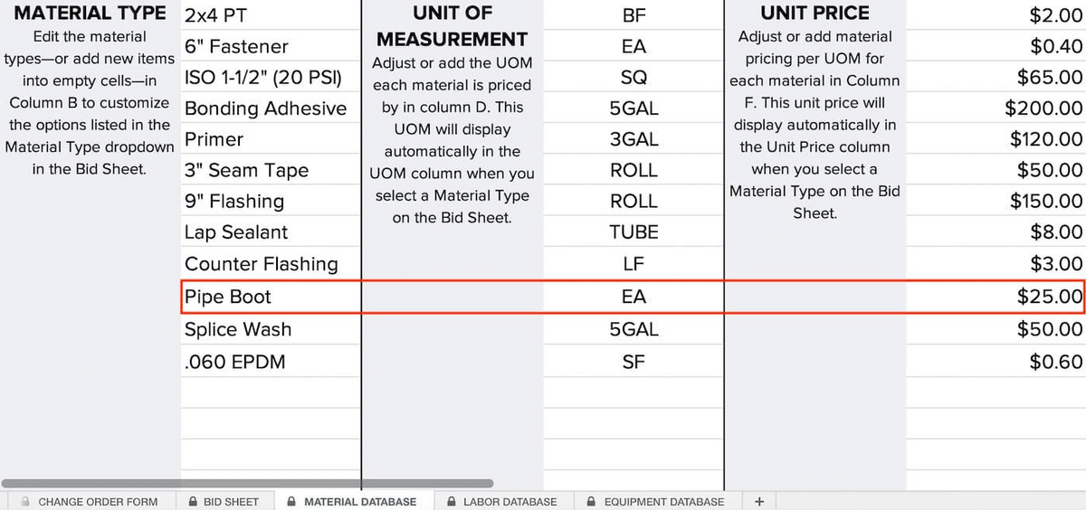 New pricing | Calculate all additional material and labor costs and include the final cost in the change order form. |