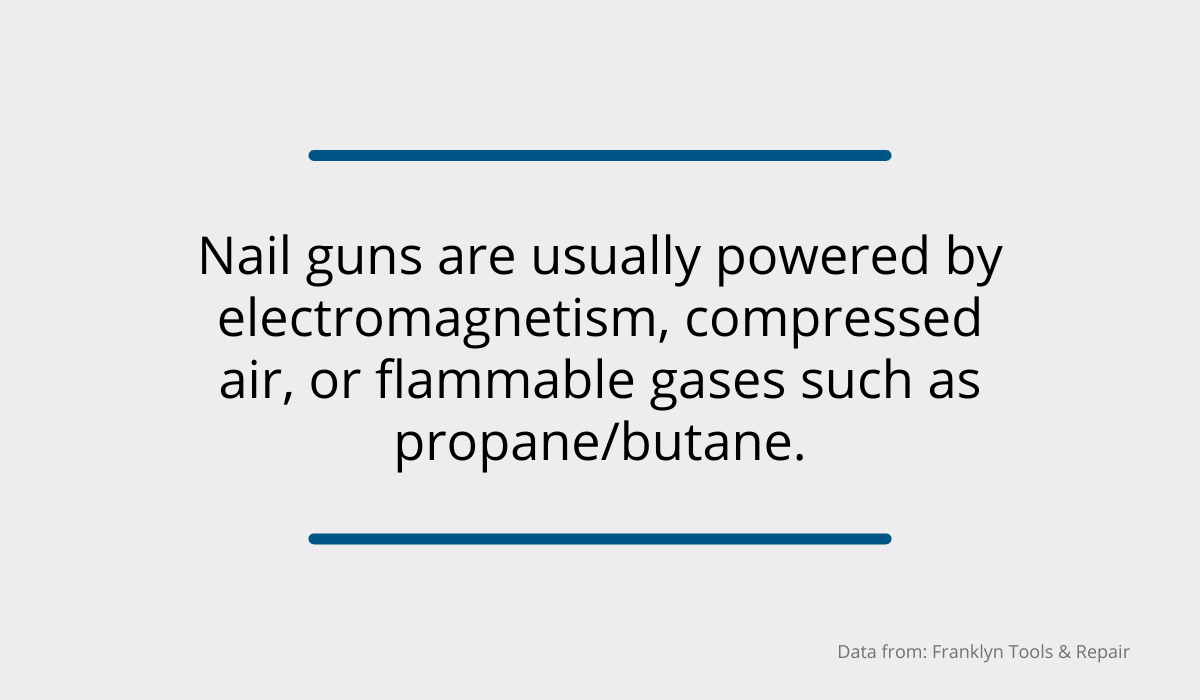 Most nail guns are powered by compressed air, so when the trigger is pulled, air pressure travels through the tubes and the barrel, pushing the nail out.