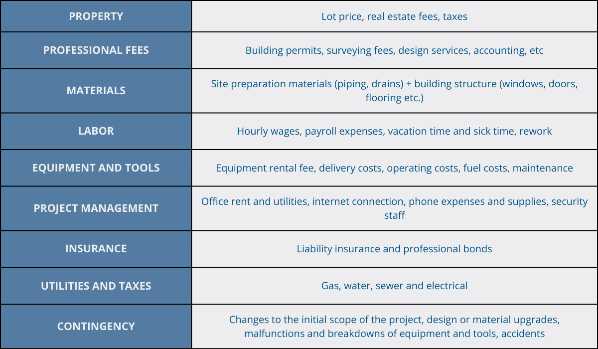 Below, you can see a more detailed list of typical construction costs to take into consideration during budgeting.