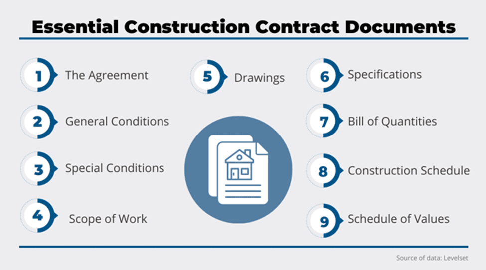 For instance, here’s a list of essential construction contract documents that are, in one form or another, typically included in a construction contract agreement, courtesy of Levelset.