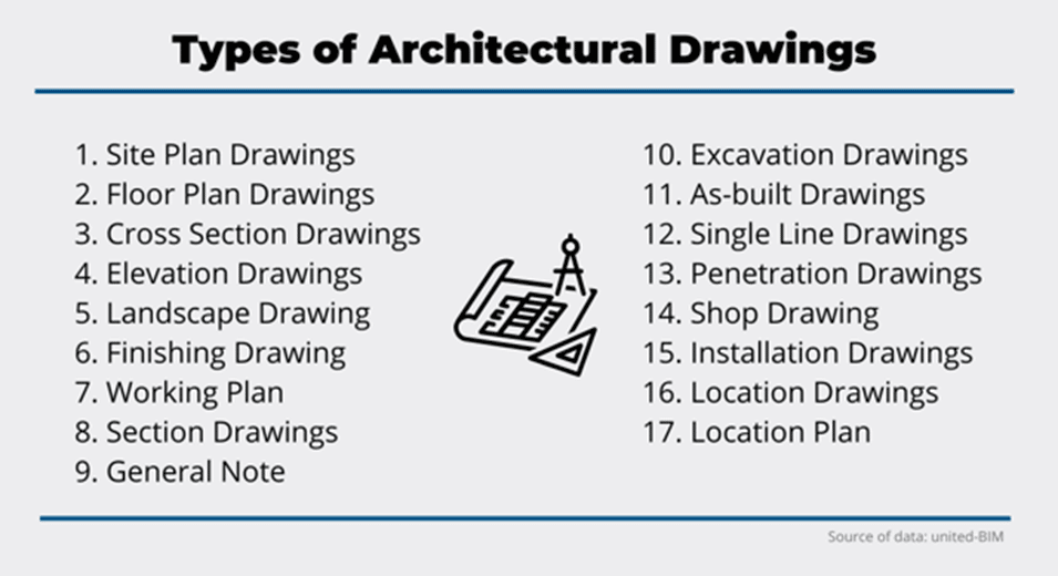 Here’s a non-exhaustive list of different types of architectural drawings, courtesy of United-BIM: