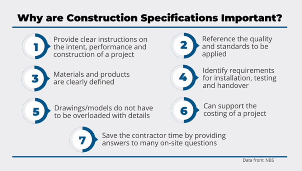 Generally speaking, specifications play a crucial role in construction projects because they do the following: