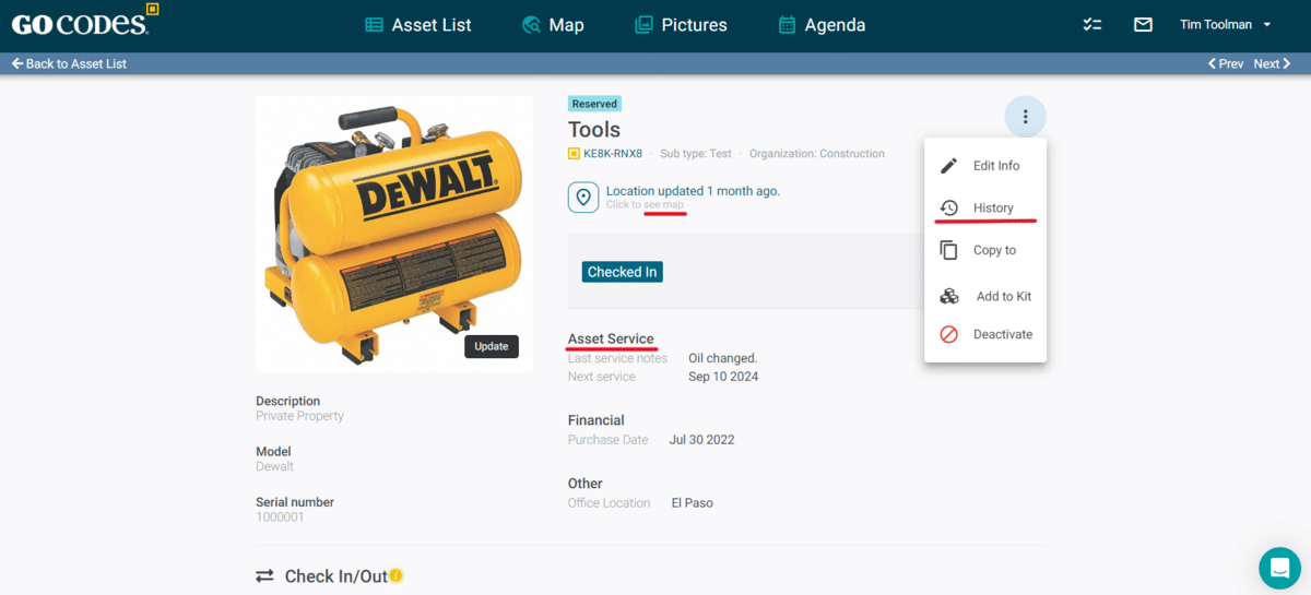 Here’s how one glance at our GoCodes Asset Tracking dashboard can help you track your equipment’s status and maintenance history and tell you everything you need to know.