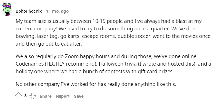 This user reports particularly enjoying go-karts, laser tag, company-sponsored dinners, and movie nights, among other things.