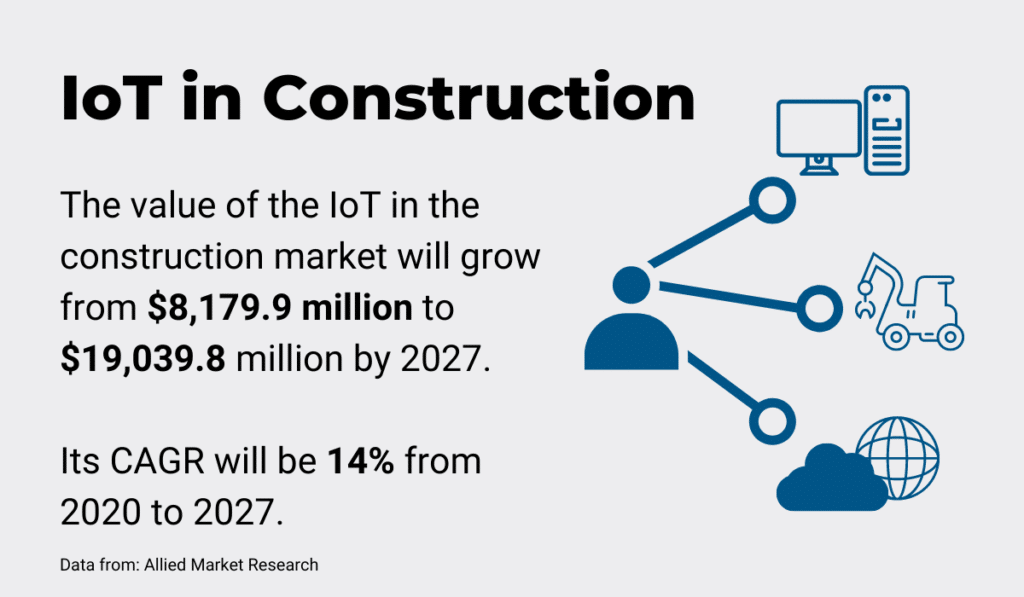 According to Allied Market Research, the construction industry is starting to see the appeal of introducing IoT in everyday business. Their report found that the value of IoT in construction in 2019 was $8,179.9 million.