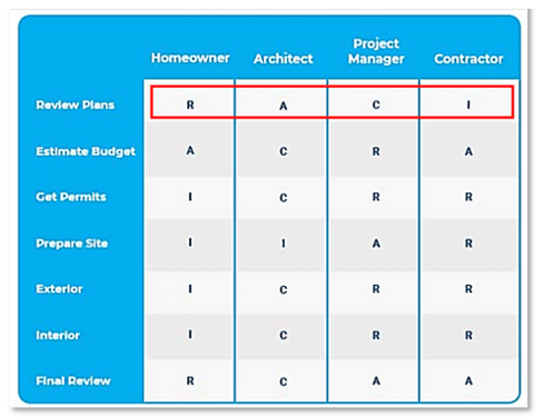 For instance, the homeowner is responsible for reviewing the plans and approving them, but the architect who designed their new home is accountable for the final design.
