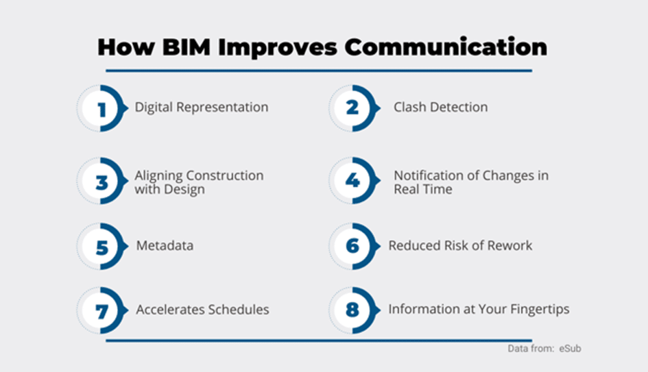 However, BIM also enhances communication between all project stakeholders and team members. It does so in different ways, showed here courtesy of eSub: