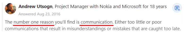 And this experience is shared by many people across different industries—including this Quora user answering the question, “What are the common causes of project management failure?”: