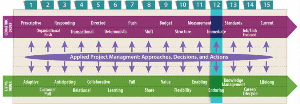The words in purple and green describe two different approaches to negotiation—geometric order vs. living order.