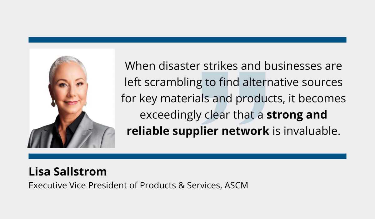 This is why Lisa Sallstrom, the Executive VP of Products & Services at the Association for Supply Chain Management (ASCM), urges companies to build strong supplier networks.
