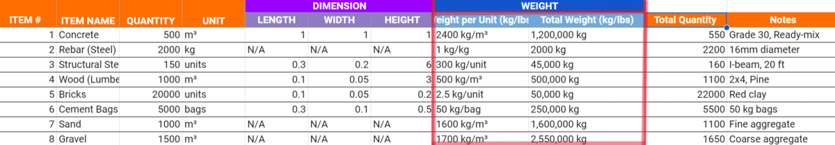 The weight of each material impacts the logistics and costs of getting it to the job site, which makes it a particularly useful metric for complex projects.