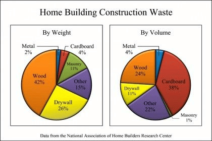 According to one study, up to 17% of all landfill waste comes from construction sites, and the construction of one small single-family home creates between 1500-3700 pounds of lumber waste.