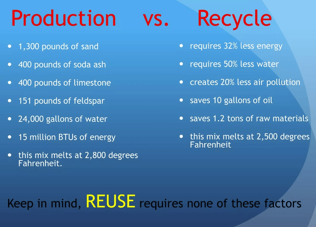 According to the World Wildlife Federation, committing to recycling glass rather than producing new material can reduce related water pollution by 50% and related air pollution by 20%.