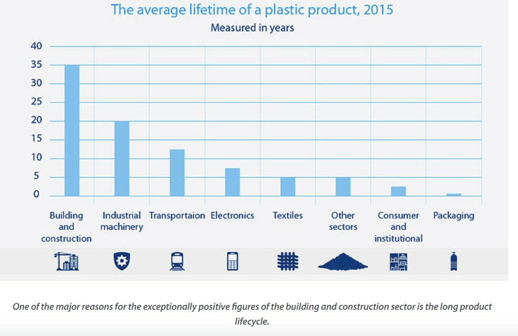 Once the plastic is in place within a construction project, it tends to last many years, as this bar graph shows: