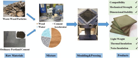This visual aid shows how wood, when paired with cement and water, can undergo reprocessing to become eco-friendly particleboard that avoids using formaldehyde during manufacturing.