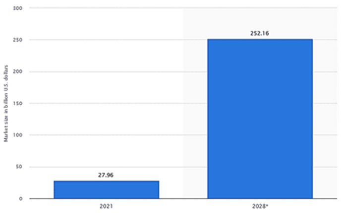 When this technology is coupled with virtual reality (VR) and their combinations (known as mixed reality, MR), it’s not surprising that the global market for such solutions is expected to grow from close to $28 billion in 2021 to over $250 billion in 2028, as shown here.