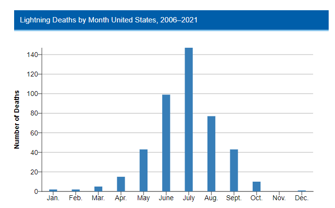 Over 140 lightning-related deaths happened in July, while almost none occurred in November and December.