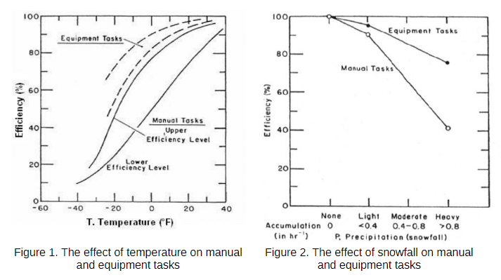 Decreased effectiveness happens with manual and equipment-related tasks since the cold slows people and equipment down, especially if accompanied by precipitation.