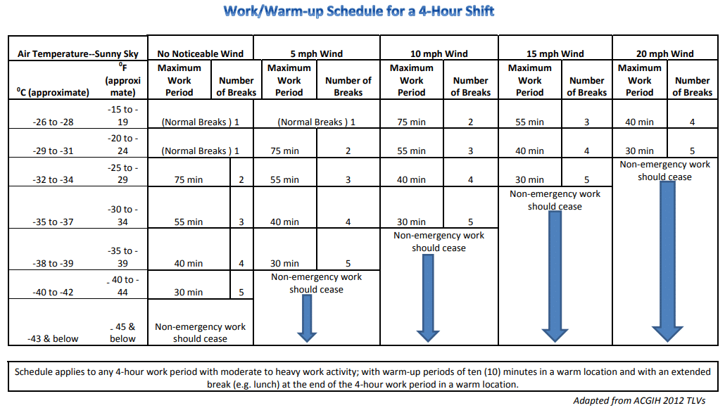 When it’s freezing, winds lower the body temperature further. Since this is a big workplace hazard, OSHA published a suggested work/warm-up schedule for a four-hour winter shift.