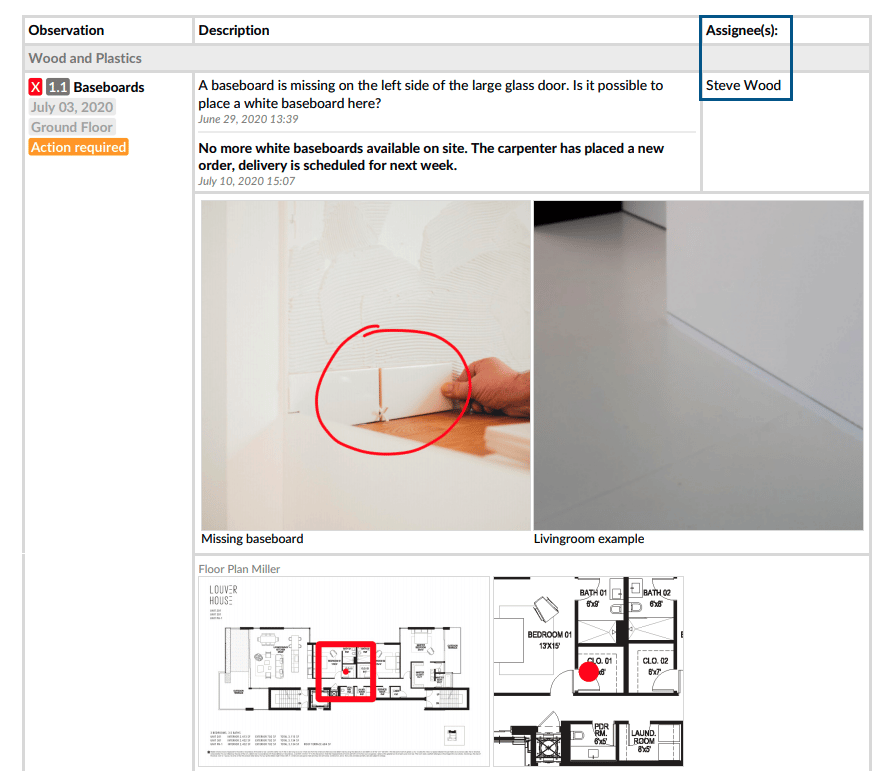 This snagging list has an “Assignee(s)” section in the top right-hand corner, making it clear that Steve Wood is going to fix the missing baseboard issue.