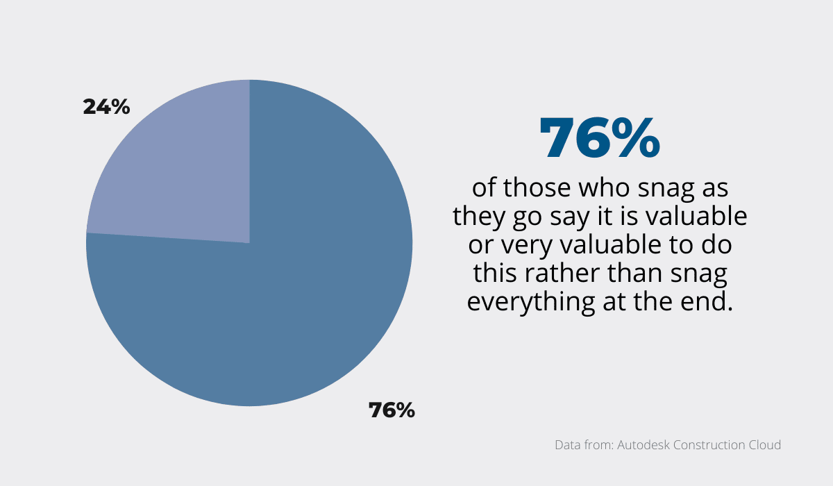 76% of individuals who practice snagging continuously throughout the project see the benefits of doing so, reports Autodesk Construction Cloud.