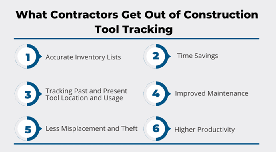 As you can see, tool tracking allows contractors to establish and keep accurate inventory lists (1) by tracking tool location and usage (3), which leads to improved tool management (4 and 5) and streamlined operations (2 and 6).