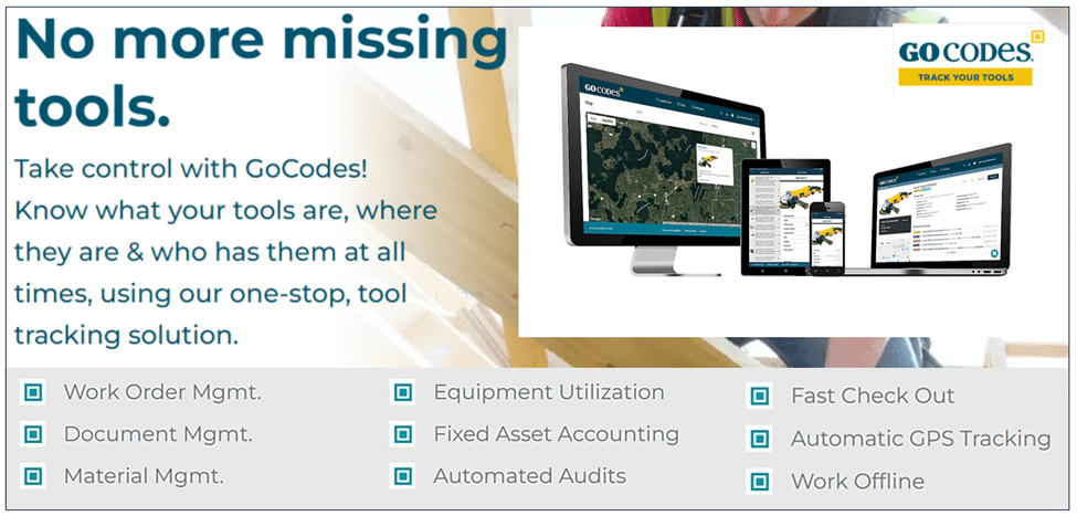 GoCodes Asset Tracking uses both patented GPS-enabled QR codes and real-time GPS trackers that, when attached to equipment, tools, or materials, allow you to track them.