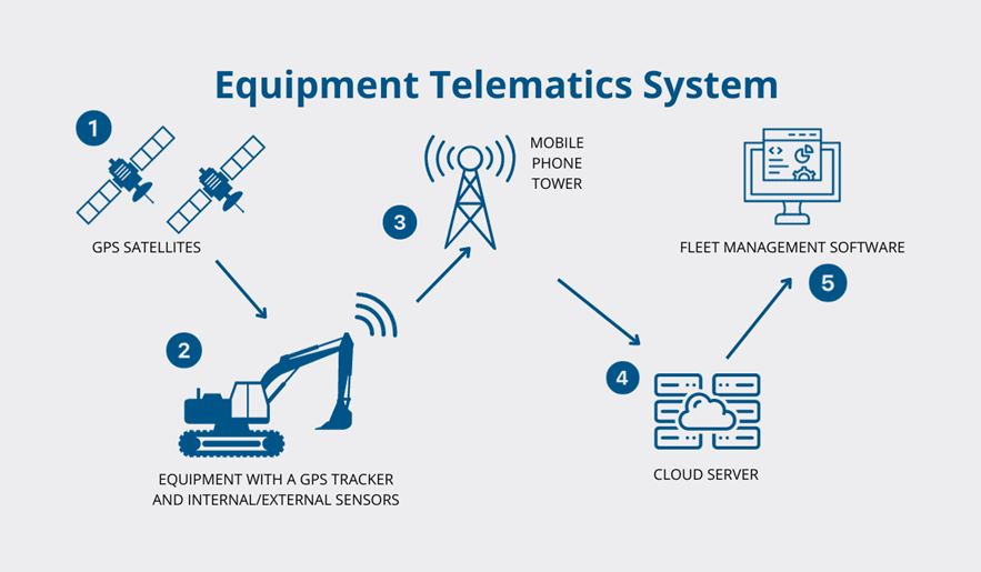 As illustrated, telematics is enabled by GPS trackers and various sensors, whether they come with equipment or were installed later.