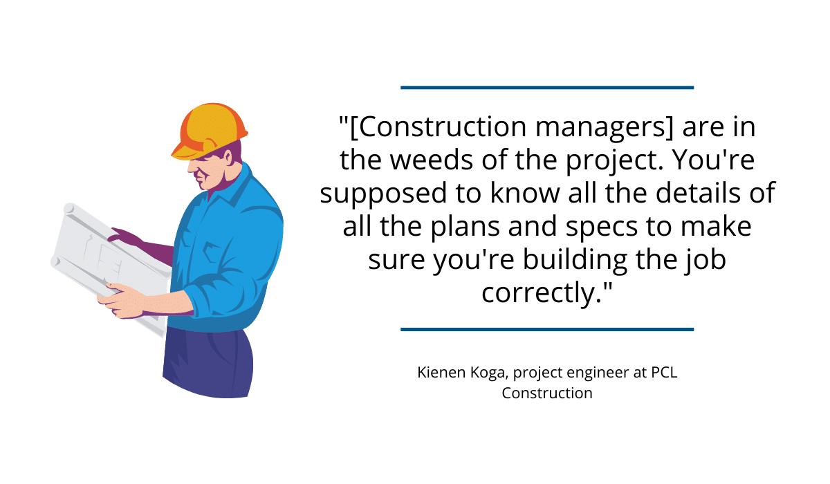 According to Kienen Koga, project engineer at PCL Construction, there are different types of project managers (with different titles at various construction companies) when it comes to their level of experience, but their primary responsibilities stay similar.