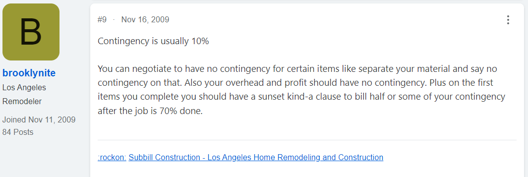 For example, this contractor has a different percentage for contingency depending on the type of project they undertake.