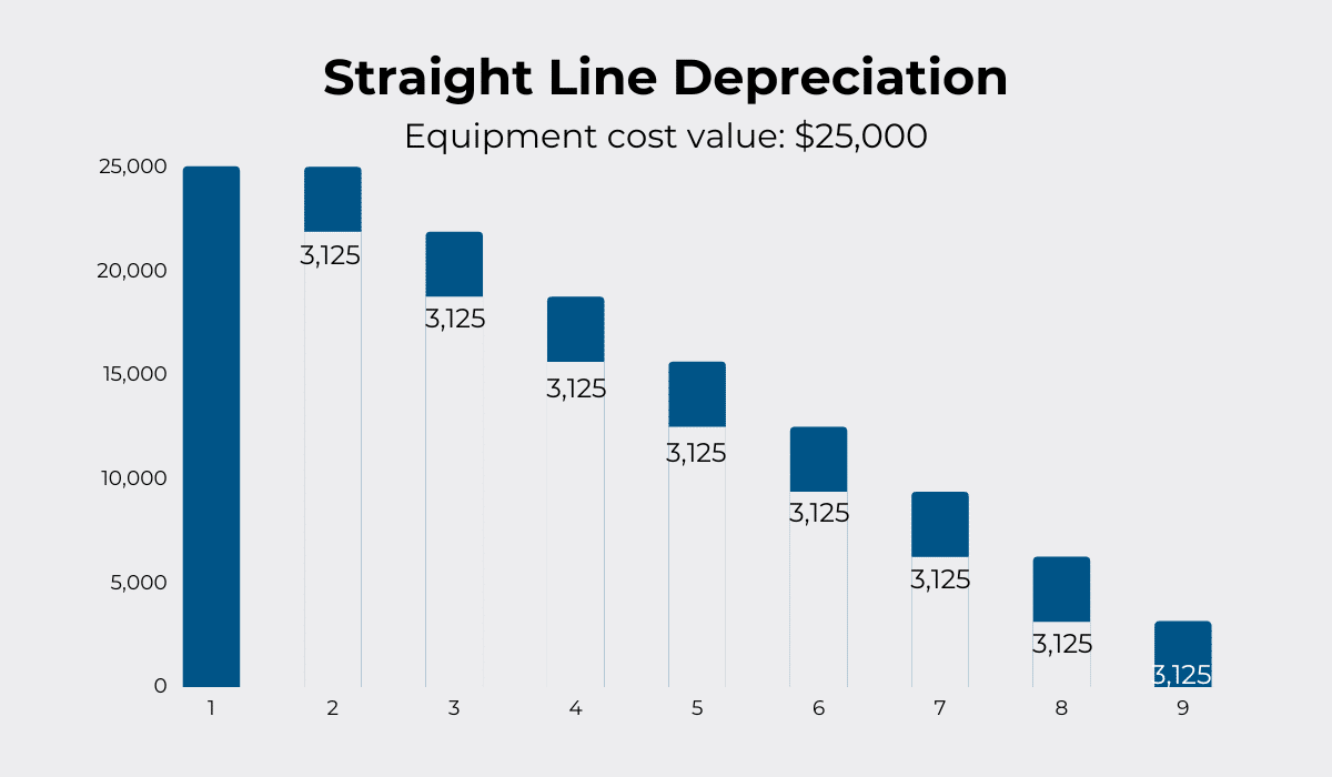 In other words, your equipment’s value is going to decrease by the same amount each year, until it reaches its salvage value.