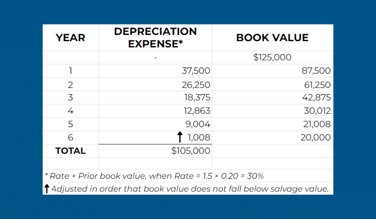 Next, we’ll take that straight-line rate and multiply it by 1.5, since business owners often choose a rate of 1.5 for this method. This gives us a 0.3 rate of depreciation.